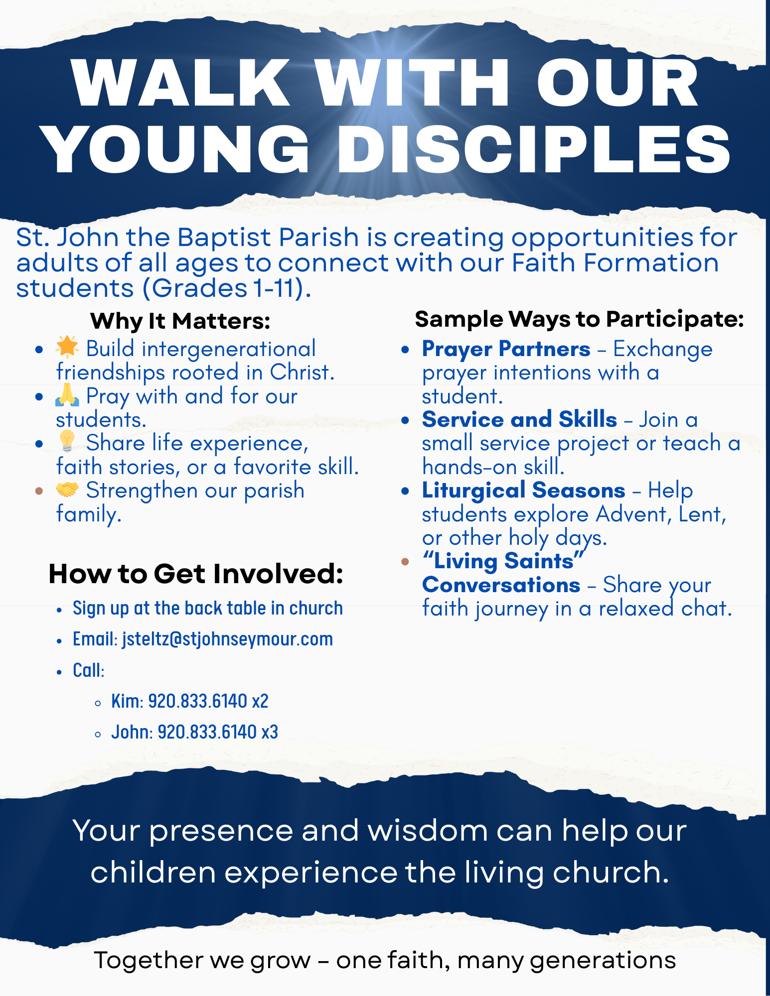 We, the members of St. John the Baptist, will, like our patron, St. John the Baptist, attempt to live lives, individually and as a parish community, that point people to the Lamb of God, Jesus Christ. (John 1:29)